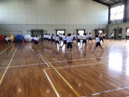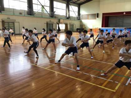体育館では、舞台上のスクリーンの修理が行われていました。その中で、体育館後方で、6年生のある学級が、ソーランの練習をしていました。