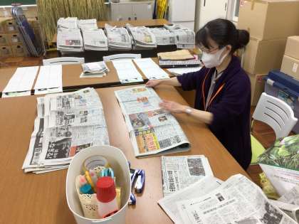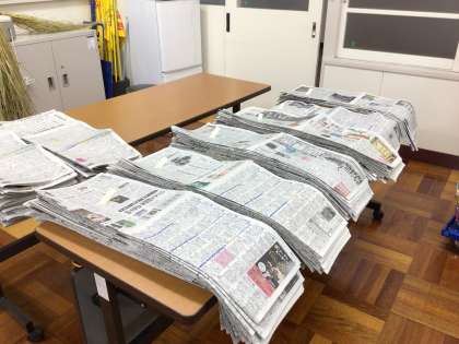 書き初めの授業で、書いた用紙を挟んでおくための新聞紙を前サポさんが準備してくださいました。1日分の新聞紙を縦半分に折ると、書き初め用紙がちょうど収まるサイズになります。今日一日で、3、4年生全員分用意してくださいました。とてもありがたいです。最近新聞をとっていないご家庭も増えたました。もし、ご家庭に新聞紙がございましたら、運動会当日に6年生の昇降口前に回収ボックスを設置しますので、お持ちいただけたらありがたいです。