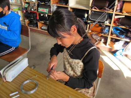 図工の学習で針金を使った工作に挑戦しています。ペンチやラジオペンチの扱いに苦戦しながらも針金を曲げたり、切ったり、丸めたりして思い思いの形に変えていき、バランスよく立ち上がる作品を作ることができました。できあがった作品は12月の個別懇談会で展示しますのでぜひご覧ください。