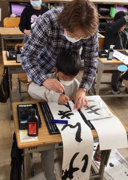 16日、17日に地域の方を講師にお招きし、書き初め指導をしていただきました。先生の筆の運びがわかるように、タブレットで写しながらスクリーンに投影すると、子どもたちは真剣な眼差しで見入っていました。先生が書き終わると、自然と拍手が沸き起こるクラスもありました。