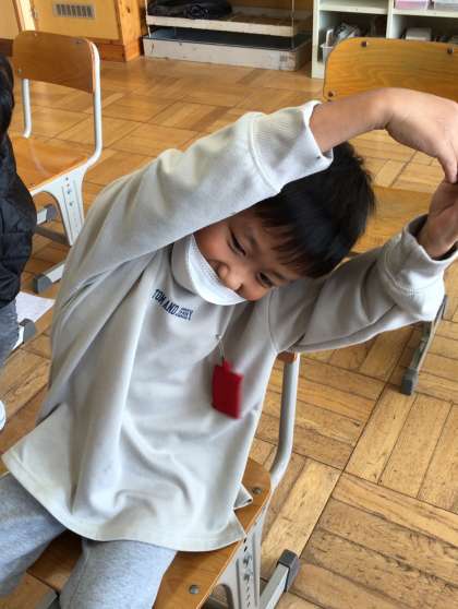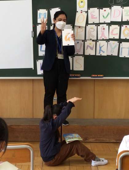 外国語活動「アルファベット」の学習では、アルファベットの大文字の仲間分けや、カードに描かれた文字を身体で表現しました。歌やゲームなどを通して英語の表現に親しみながら、意欲的に学習に取り組む姿が見られました。