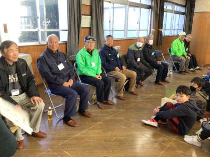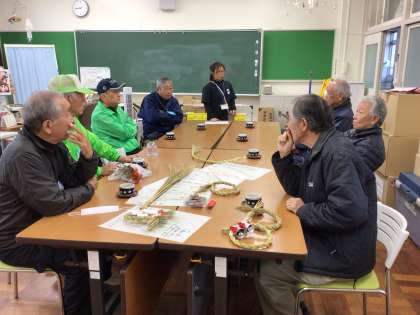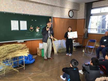 稲作りでお世話になっている成瀬様をはじめ、8名の方が5年生にしめ縄作りを教えてくださいました。グループに分かれて、一つ一つ丁寧に教えていただき、素敵なしめ縄が完成していました。