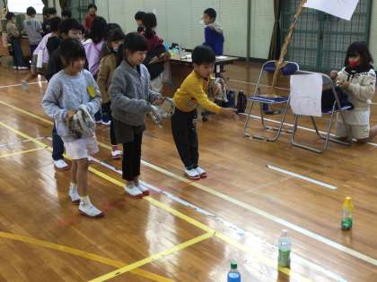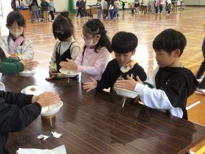11月30日と12月4日に、2年生から「おもちゃまつり」に招待してもらいました。2年生が学習の一環で作ったおもちゃを、遊び方を説明してもらいながら夢中で楽しみました。得点が入ったりゲームをしたりすると、かわいいイラストつきのお土産をもらうことができ、なくさないようにと宝物のように握りしめる姿が見られました。