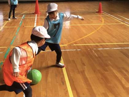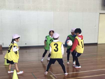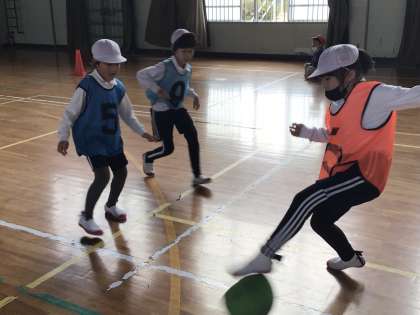 体育では「ペコットサル」をしています。チームで作戦を立てたり、上手に取り組むコツを教えあったりしながら練習を行っていました。友達に「すごいね!」「おしい!」などと声をかけて励ますことができる子が増えてきました。練習を重ねるたびに、チームの絆が深まっています。