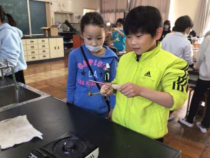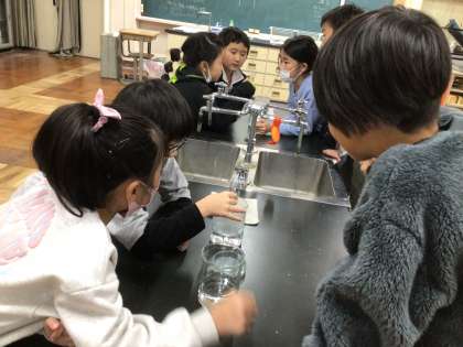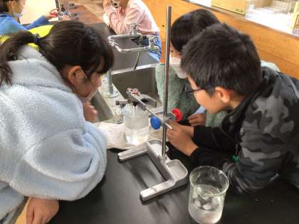 理科「ものの温度と体積」では、空気、水、金属の順でそれぞれ温度が変わると体積はどうなるのか、実験を行いました。実験で第一理科室を使うことが初めてだったので、とてもワクワクしている様子でした。安全に気をつけながら、体積が変わる様子をじっくり観察し、変化が見られると「あ!かわってる!」「おお!すごい!」とたくさん声をあげていました。これからの実験もいろいろな気づきができるといいですね。