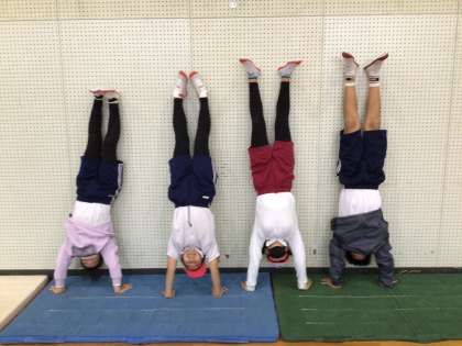 体育の学習でマット運動をしています。高学年では、倒立やロンダートなどの難易度の高い技にも挑戦します。友達と教え合いながら、練習し、成功したときに喜び合う姿が印象的です。写真は壁倒立の4人組です。一斉に成功おめでとう!