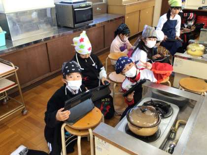 家庭科の学習ではおにぎりパーティーを開催しました。総合で育てたお米を精米し炊飯しました。自分たちで育て、調理したおにぎりは格別においしかったですね。しめ縄づくりのボランティアさんにもお礼の気持ちを込めておにぎりを食べていただきました。