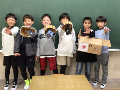 大谷翔平選手からの贈り物が届きました。大谷選手からのメッセージを聞き、グローブを見て歓声が上がり、にこにこ笑顔で手にはめていました。「かっこいい!」「ボールを使ってキャッチボールがしたいな」などと喜びの声が飛び交っていました。大谷選手への感謝の気持ちをもって、みんなで大事に使っていきたいです。