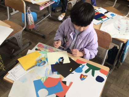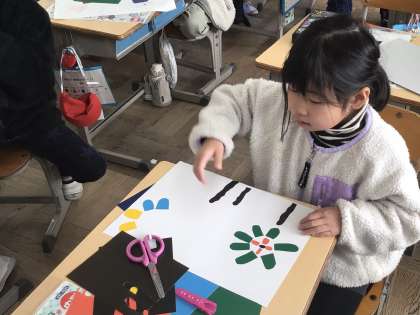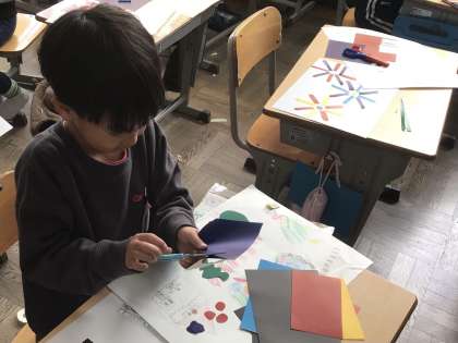 図工「たのしくうつして」では、2年生の思い出に残ったものを題材に紙版画を作っています。カラフルなシールを組み合わせて模様を作ったり、紙にうつしたらどう見えるのか友達と相談しながら考えたりして工夫を重ねる姿が見られました。どのような作品が出来上がるのか楽しみです。