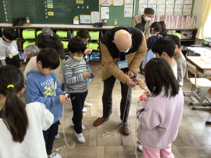 1月18日に、生活科の学習で『むかしあそびをたのしむ会』をしました。けん玉、竹ぽっくり、こまなど、昔遊びを教えてくださるボランティアの方がたくさん来てくださいました。