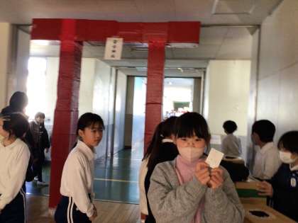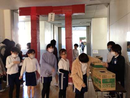 安全委員会が企画した「安全神社」が今日最終日を迎えました。全校児童の安全意識を高め、登下校を安全に行うというねらいで、1/22から8日間実施しました。ある日突然、中校舎の真ん中に真っ赤な大きな鳥居が現れ、期間中子どもたちが列を作り、おみくじを引いていました。中身はいろいろで、「通行人に道をあける」「3列にならず歩く」「ボランティアさんにあいさつ」などなど、登下校で守りたい内容が書いてあります。達成したら昇降口の達成ボックスに入れると個人点がつきます。学年対抗下校チェックと併せて行うことで、一番点数の高い学年は学年レクが行えるようです。楽しみながら、安全や交通マナーへの意識を高められる取組みで、個別下校にも生かされています。