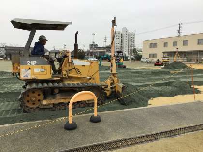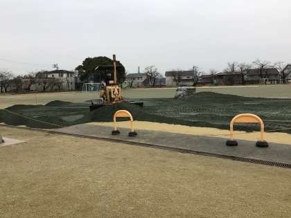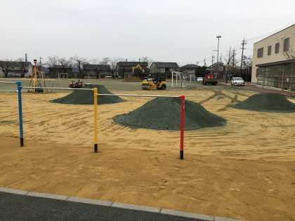 運動場北側の修繕がだいぶ進んでいます。今日は新しい土の上に緑色土が敷かれました。運動場への車の乗り入れができなくなりご不便をおかけしますが、子どもたちにとって安全な運動場になり職員一同安心しています。ご理解、ご協力をお願いいたします。