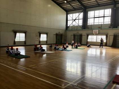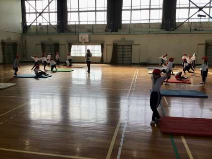マットの上で、ゆりかごの動きをしたり、だるまのようにころがったりするなどして、前転の準備をしました。上手に技を行うには、どうしたらよいかを発表し合って練習していきました。最後には前転をしてかっこよくポーズをきめる姿が見られました。