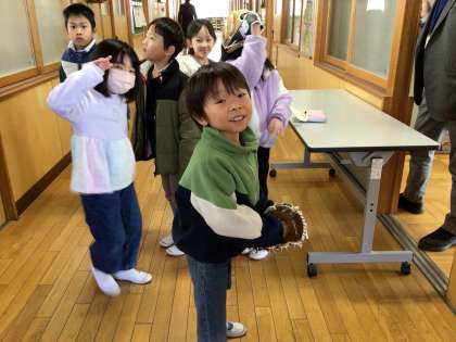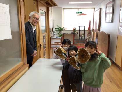 放課になると、大谷選手のグローブをお目当てに、校長室前に子どもたちが入れ替わりやってきます。「ずっとはめていたい!」と何度もはめにくる子もいて、大人気です。運動場の修繕が終わったら、外でキャッチボールを楽しむ子どもたちが見られそうです。