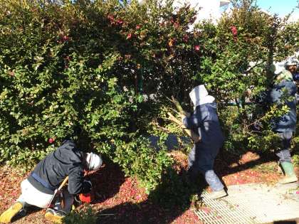 昨日と今日、シルバー人材センターの方が垣根の山茶花の伐採と剪定をしてくださいました。正門から南側の敷地の端までが、隙間なくうっそうと茂っていて、フェンスの外にも枝が張り出していましたが、見違えるほどすっきりしました。運動会前の運動場周りの草刈りに続き、今回も10名の方がとても丁寧に作業してくださいました。ご来校の際はぜひご覧ください。