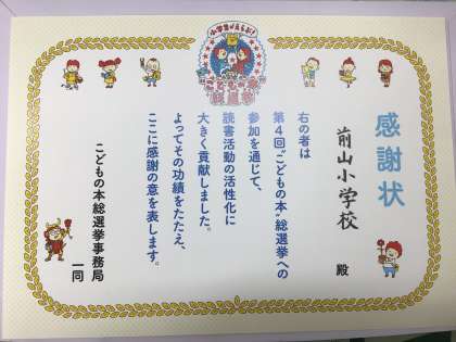 本校の児童も参加した「“こどもの本”総選挙」の結果がでたようです。ぜひ、下記リンクからランキングを確認してみてください。また、前山小学校にこどもの本総選挙事務局から感謝状が届きました。図書室に飾る予定です。