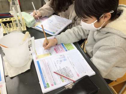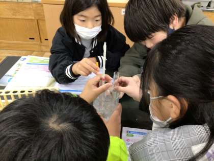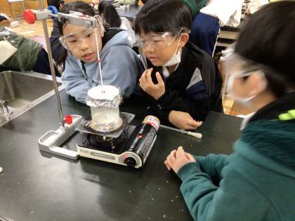 理科「すがたを変える水」の学習で、水は温度によって水蒸気や氷に変わることや水が氷になると体積が増えることを学びました。実験で水が水蒸気や氷に変わる姿を目の当たりにして、とても驚いていました。