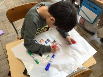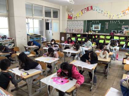 作った作品を持ち帰るバッグに自分の好きな絵を目一杯書きました。描く絵を見てみるとそれぞれ上手になっているなと感じました。友達と描いた絵を見合って笑い合ったり、一年間であったことを話し合ったりする姿が見られました。一年生もあとわずかですが、二年生に向かって毎日頑張っています。