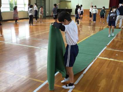 1年生の交通安全教室が無事終了しました。各学校の交通指導員の方9名が来校され、交通ルールやマナーについて教えてくださいました。安全教室が終わった後、6年生の子が片付けを手伝ってくれました。長崎先生からマットの正しい巻き方を伝授され、とてもきれいに巻いてくれました。6年生はいつも気持ちよく手伝ってくれるので、とても助かっています。