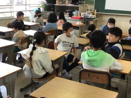 今年度は、朝の学びタイムの「スピーチ」を充実させていこうと取り組んでいます。全員が参加できるように、グループ単位で曜日ごとにスピーチする人を決め、1週間同じテーマでスピーチをしています。「みんなに聞こえる声で」「私が〜したことは〇つあります。一つ目は・・・の形で話すこと」「話し手に質問したらつなげて自分の考えを話すこと」など達成を目指す目標を一つずつ増やして取り組んでいます。はじめは緊張していた子どもたちも、だんだん慣れてきて話がはずみ、時間がきても話が終わらないグループも出てきました。これからの子どもたちのコミュニケーション力の高まりが楽しみです。