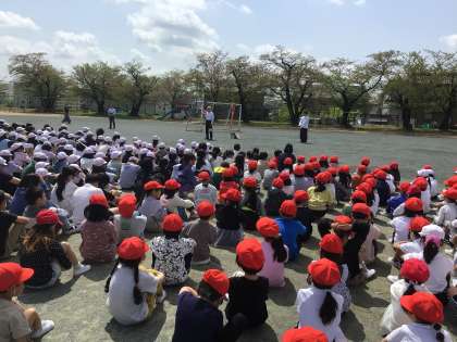 17日には今年度1回目の避難訓練がありました。新しいクラスからの避難の仕方を確認し、「お、は、し、も」を守って避難しました。