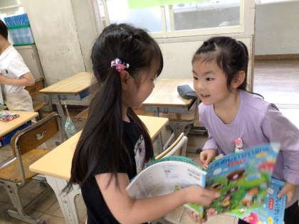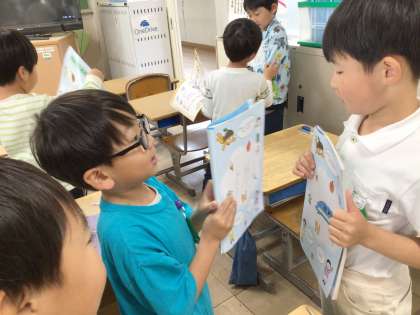 入学して3週間ほどが経ちました。生活科では、自分が好きな物を絵に描き、友達と伝え合う活動を行いました。1年2組では、次々にペアを変えながら、多くの友達と話すことを目標にしました。友達の話に耳を傾けながら、笑顔で楽しく話す姿が見られました。体育では、安全な遊具の遊び方を学びました。雲梯や登り棒など、難しい遊具にも挑戦しました。雲梯を最後までやり切った子には、自然と拍手が起こりました。