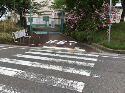 東門の「止まれ」の文字が薄くなっていたので、公務手の越智さんと校務支援員の南雲さんが塗り直して、新たにストップマークを貼ってくださいました。よく見えるようになり、子どもたちも今まで以上に意識してくれると思います。