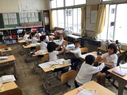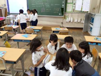 今日は、一年生が教室のことをわかるようにするために、詳しい先生に聞くための質問を考えました。目的をもって、聞きたいことが伝わるような質問になるよう、練っています。