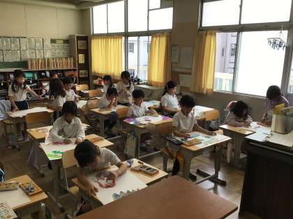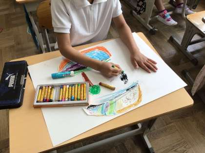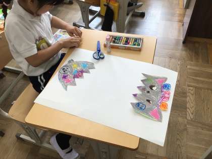 ふしぎなたまごなので、たまごの形、色、割れ方、中から飛び出してくるものを自由に考えて作っています。画用紙からはみ出して割った卵を貼ってみたり、中からサンタクロースが飛び出したりするなど、子どもたちそれぞれが思い思いの独創的な作品を描いています。
