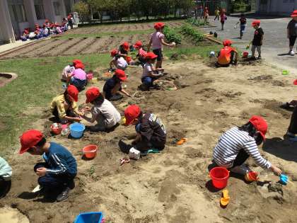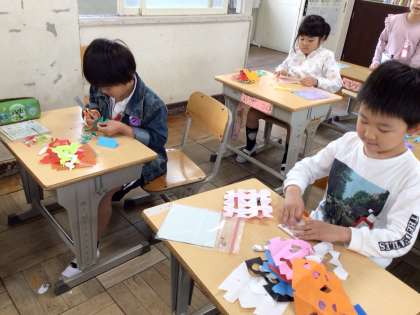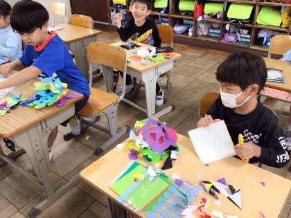 図画工作科で、「ちょきちょきかざり」や「つちやすなとなかよし」の学習をしました。「ちょきちょきかざり」では、まずはさみの正しい使い方を確認しました。折って切って開いたらどんな形になるか、わくわくしながらいろいろな形に切っていました。「仮面ができたよ」「雪の結晶みたいな形ができたよ」とたくさんの作品ができました。学校公開日に掲示しますので、ぜひごらんください。「つちやすなとなかよし」では、家から持って来た砂遊びセットやプリンカップなどを使って楽しく活動しました。山や川を作ったり、砂を型抜きしたりして、砂場に色々な世界が広がりました。川をのばして、となりのグループと繋がる子、深く掘った池に水を運んで楽しむ子、思い思いに砂の感触を楽しみながら表現しました。