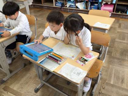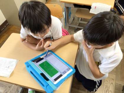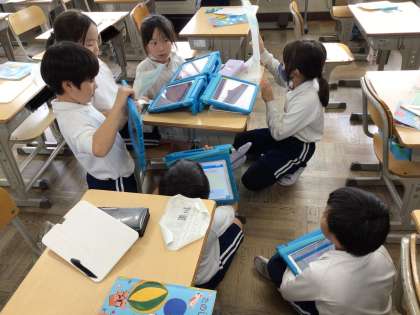 2年生の教室では、学校探検で1年生に出すクイズをグループごとにタブレットを使って作っていました。