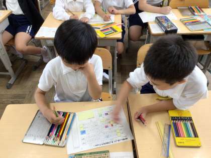 2年生の学校探検に向けて準備で、学校のマップに色を塗っている子もいました。きっと1年生も喜んでくれるでしょうね。