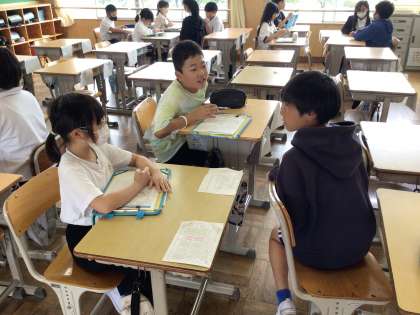 国語科の「知りたいことを聞き出そう」の学習では、6年生にインタビューをして、委員会活動に取り組む際の注意点などを教えてもらいました。聞きたいことを整理し、メモを生かしながらインタビューをするとができました。