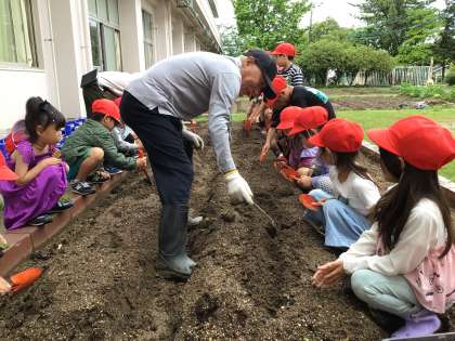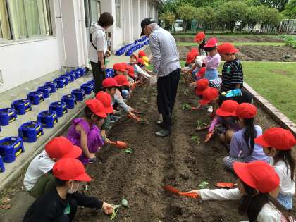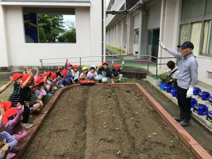 地域講師の東城様が1年生のサツマイモの苗植えを教えてくださいました。たくさんサツマイモができるために苗を寝かせて植えることなど、わかりやすく教えてくださいました。