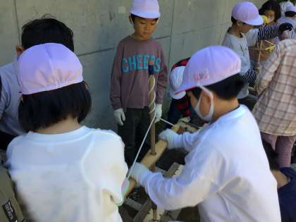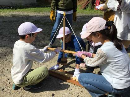 火おこしの様子です。 どの班も苦戦しています