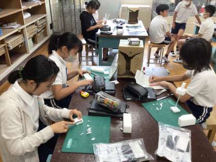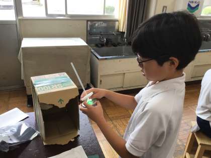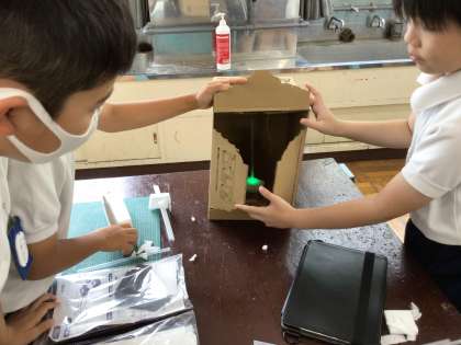 図工「光の形」の授業の様子です。ストローやメラミンスポンジを工夫して形を作り、下から照らす光の形を楽しみます。自分たちの表現したい形に近づくように試行錯誤しながら取り組んでいました。試したことが予想以上にキレイにできて、「先生見てください。」と嬉しそうに声をかけてくれる子もいました。