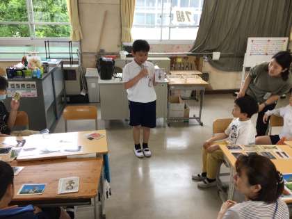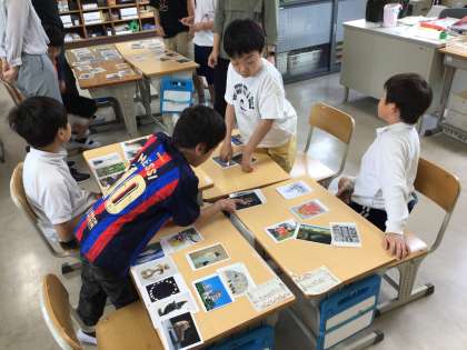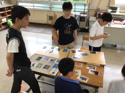 図工の学習でアートカードを使って、同じカード探しを行いました。一部分の絵をヒントに、色々な絵や写真の中から、よく見て同じカードを探し、「これじゃない?」と、見つけたときには喜び合っていました。また、カードの中でお気に入りを探して、カードを見せながら、その理由を一人一人発表しました。