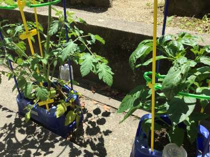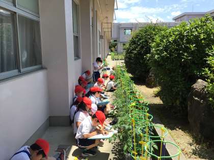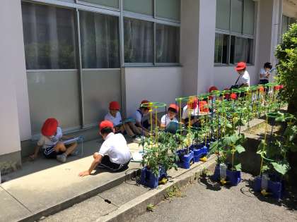 子ども達は葉っぱが大きくなったり、小さな実ができていたりする様子を見て喜んでいます。おいしい野菜になるように毎日の水やりも一生懸命に取り組んでいます。