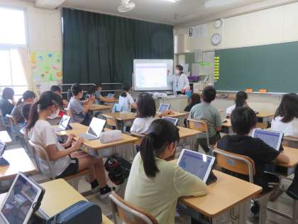 火曜日にICT支援員の方に来ていただき、「スクラッチ」というプログラミングの学習を行いました。「スクラッチ」を初めて使用する子どももいたため、キャラクターの動かし方や色の変え方など基本の操作を学びました。授業後に、「プログラミングについて楽しく学ぶことができた」と教えてくれる子どももいました。