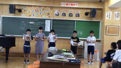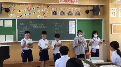 音楽科の「歌声をひびかせて心をつなげよう」の学習では、「こいのぼり」を歌いました。大きなこいのぼりが空高く泳ぐ様子を想像しながら、のびのびと歌うことができました。