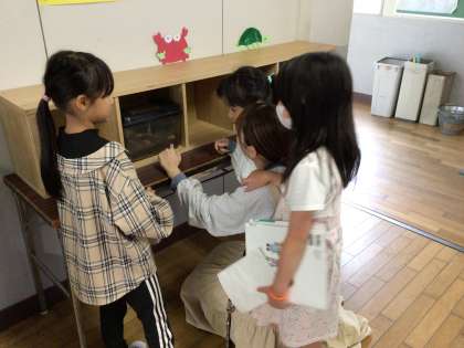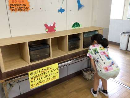 生き物広場に、新しい仲間が増えました。昨日前サポさんにいただいた、カブトムシの幼虫とサナギです。子どもたちも興味津々で、のぞき込むように観察していました。これから、魚もさらに増える予定で、生き物広場が子どもたちの憩いの場になりつつあります。