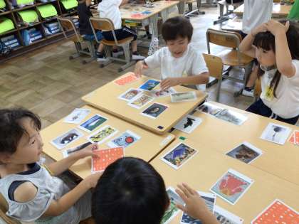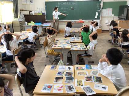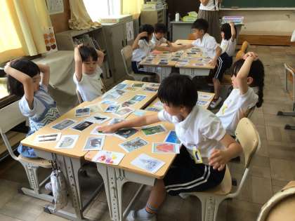 1年生の教室で、アートかるたの授業をしていました。様々な美術作品のカードの中から、担任が選んだカードの様子を口や体で表現すると、間髪入れずにカードを取っていました。大盛り上がりで、どのグループも笑顔があふれていました。