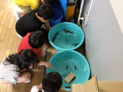 大人気の生き物広場です。最近はカブトムシがサナギからかえったり、ザリガニやクワガタが仲間入りしたりしました。環境委員さんが水換えや掃除を頑張ってくれています。