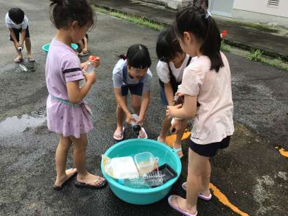 生活科の学習で、水遊びをしました。どうやったらうまく船が浮くかを考えながら、浮かべていました。次の水遊びは改良版です。レベルアップした水遊びに期待です。