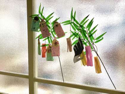 7月に入りました。7月といえば七夕、ということで笹の葉飾りを作りました。みんなの願い事が叶いますように。