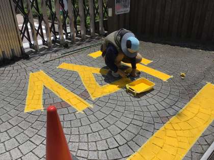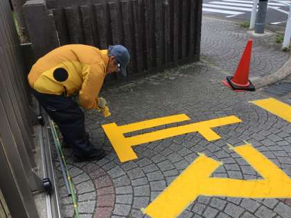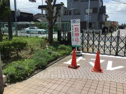 正門を出ていく車から歩行者や自転車が見やすいように、越智さんと岩崎さんが木を切ったり横断幕を移動してくださいました。また、越智さんと南雲さんで、消えかかっていた「止マレ」の文字を塗り直してくださいました。誰も事故にあってほしくないとの思いで、暑い日でしたが一生懸命作業してくださいました。いつもありがとうございます。