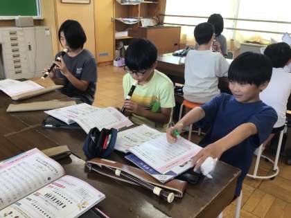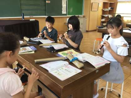 音楽科では、「小さな世界」の曲をリコーダーで演奏しています。4年生の時に比べて、指使いの難しい音もありますが一生懸命練習している姿が見られました。また、動画を撮り自分の音を聞いて修正したり、何度もリズムを確認したりしている児童もいました。