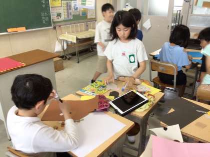 図工科の「あんなところがこんなところに」の単元では、学校にあるものや模様を元に様々な作品を作りました。階段やレールなどにお寿司を作ったり電車を乗せたりしているグループもいました。