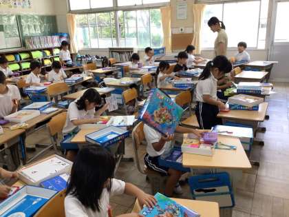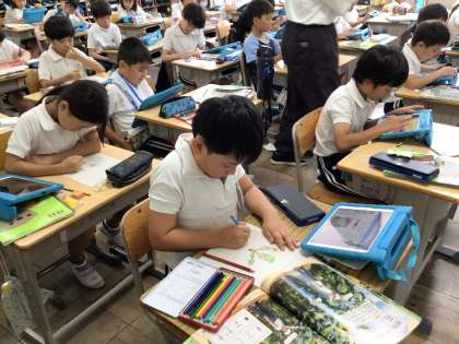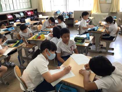 グループ学習もとても上手にできていました。また、タブレットで撮った写真を見ながらノートに書き写している学級もありました。1年生は使っていた算数セットを時間内に丁寧に片付けていました。