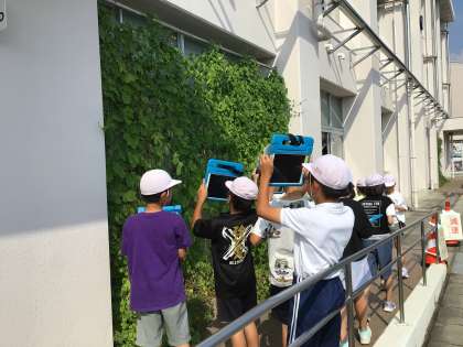 昨日と今日は熱中症指数が警戒に達しなかったため、水分を取って必ず帽子をかぶり、休憩しながらという約束で、長放課は外で遊ぶことができました。4年生が世話をしている緑のカーテンの様子をタブレットで写真に撮っていました。本当に立派に成長しました。